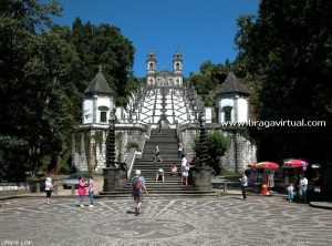 O Escadório do Bom Jesus desenvolve-se em lances de escadas e de patamares e está dividido em 3 partes: Escadório do Pórtico, mandado construir pelo arcebispo D. Rodrigo de Moura Teles, em 1723; Escadório dos Cinco Sentidos (Fonte da Visão, do Ouvido, do Olfato, do Gosto e do Tacto) , de autoria dos arquitectos Moura Teles e André Soares, e o Escadório das Três Virtudes (Fonte da Fé, da Esperança e da Caridade), de autoria de Carlos Amarante.