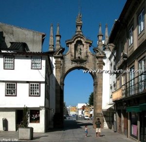Verdadeiro “ex-libris” da cidade, construído no século XVIII, por ordem de D. José de Bragança, para substituir a porta demolida das antigas muralhas. Da velha cintura de muralha que guardava a cidade medieval, reconstruída por D. Dinis e D. Fernando, apenas restam algumas torres e duas portas: a famosa Torre de Menagem e as Torres do Campo das Hortas, das Carvalheiras e de S. Tiago (esta transformada em capela sob o traço de André Soares, em 1756-59); e as portas de S. Tiago (medieval), da rua do Souto, chamada Arco da Porta Nova, aberta em 1512 e reedificada em 1773, sob o desenho de André Soares.